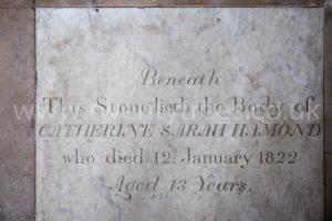 On 12th January 1822 Catherine Sarah Hamond (age 13) died. Grave slab in All Saints Church, West Acre [Map].