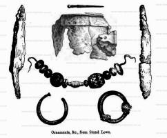 Thomas Bateman 1845. On the 19th of June, 1845, a very interesting barrow, called Stand Lowe [Map], was opened, which is situated upon an elevation, opposite to Moot Lowe [Map], on the other side of the Dovedale road. On digging towards the centre of the barrow, numerous chippings of flint were found, amongst which were six rude instruments, mostly calcined, one of which had been used as a saw, and is very curious; about the same place was found a broken whetstone. The centre being gained, an iron knife was found, of the kind attributed to the Saxons by the modem school of antiquaries, which was immediately followed by a bronze box, of a circular form and much decayed, ornamented by rows of little indented dots, and having a moveable handle, wrought into the form of a serpent's head, the eye being perforated through for convenience of suspension the hinge of the lid is very perfect, and of workmanship which would not disgrace a Birmingham artisan of the present day; near this box lay a small knife which appears to have been protected by an iron sheath, two bronze rings, which had evidently been used as buckles or fibulae, and some other articles of iron, which bear evident marks of having been folded in linen, and are now so shapeless from the effects of rust, that it is difficult to assign a use for them. About the same place was found a small piece of a ribbed vessel of thin yellow glass. There being no indications of bone, or change of colour in the soil, the scrupulous care, so necessary on these occasions, was not used; consequently, the hack was struck amongst a quantity of glass-beads, fortunately, one only was broken; on examination were found eleven glass beads of various shapes and sizes, three of which are remarkably variegated; a bead made of silver wire twisted in a spiral form, and diminishing in the size of the whorls each way from the centre; and a silver needle, with a curiously-formed eye. Amongst the beads were picked up the remains of twenty-six human teeth, consisting merely of the enamel or crown of the tooth; which, owing to some cause perhaps the nature of the soil were the only vestiges of the primeval beauty over whose mouldering remains this barrow had been raised by the hand of affection. At the time of interment the beads were doubtless placed round the neck and from the position of the box, knives, and rings, it is equally evident that they lay on the left side of the body. In Douglas's "Nenia Britannica," plate 18, page 72, a somewhat similar box, containing thread, and a similar needle are figured, which were found in a barrow at Sibertswold, in Kent, opened by Dr. Faussett, about the year 1767. The fact of finding instruments of flint with an interment of this comparatively modem description is rather remarkable, but not by any means unprecedented.