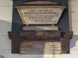 After 1858. Monument at the Cathedral Church St Nicholas, Newcastle upon Tyne [Map] to John Hodgson and his wife Sarah.