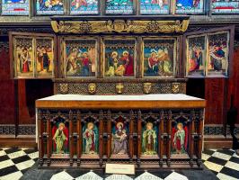 February 1909. Cathedral Church St Nicholas, Newcastle upon Tyne [Map]. "Arts and Crafts" style, the design consists, of five panels on the front, with richly-traceried heads and separated by small buttresses in pairs; with small traceried panels between. Similar panels occupy the ends. The five large panels are filled with painting's representing; in the centre, Our Lady and Child, with attendant angels on the others. Carving was executed by Ralph Hedley of Newcastle, all from the designs of Messrs. Oliver, Leeson, & Wood, architects. The altar was dedicated in February 1909.