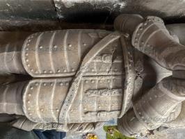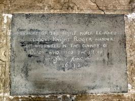 Sir Roger asked to be buried in Whitwell church with as "small funeral pomp as may be, having respect to my birth and calling". The Manners tomb on the west wall of the North Transept, composed of Chellaston marble, is notable for Sir Roger's recumbent effigy in armour. The visor on the helmet is known to be very unusual, even rare for the 1630s when the figure was carved. The carvings on the plinths at the base of the columns refer to military matters and those on the sides would appear to be places connected with his life, such as parliament, a temple (eastern) for the Inner Temple, a church with a spire (Lichfield or Bakewell?) and a fortified dwelling (Haddon or Belvoir?).