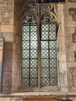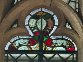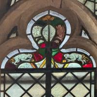 The North Transept of the Church of St Lawrence, Whitwell [Map] with the "Monkey Window". The border glass included seated figures of apes holding urine flasks, probably early 14th Century. Apes were kept as pets by the wealthy. In medieval symbolism apes represented fraud and indecortum, and were used by carvers and glass painters to satirise.