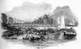 On 11th May 1845 the Yarmouth suspension bridge spanned the River Bure at Great Yarmouth, Norfolk [Map] collapsed under load from a crowd who had gathered to watch a circus stunt on the river. Some 79 people, mainly children, were killed. Cooke's Royal Circus was in Great Yarmouth, and as part of a promotion, it was advertised that a clown, named Arthur Nelson, would sail up the River Bure in a washtub pulled by four geese on 2nd May 1845. Several thousand people viewed the clown from the river banks and at least 300 in a crowd, 4 to 5 deep, on the southern footway of the bridge. At around 5.40 pm, one of the eyebars in the southern suspension chain failed; members of the crowd witnessed this, but no action seemed to have been taken to evacuate the bridge. The second eyebar in that portion of the chain took up the full load for around five minutes before it too failed. The south side of the deck fell into the river, though the north end remained suspended by the surviving chain, and the majority of the crowd were tipped into the water, which at this point was 2.1 m deep.