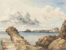 After 1837 James Bridges (age 35). "Elizabeth Castle from the rocks, and two rocky costal scenes". First inscribed "The Hermitage and the Rocks, where Cattle Vessell of France was wrecked about 1837 near here" and further inscribed "Old Landing Place Jersey by James Bridges".
