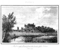 Where now is the seat of my lord Hartford was the site of the Roman castrum, for they find foundations and Roman coins; I saw one of Titus in large brass: but towards the river, and without my lord's garden-walls, is one angle of it left very manifeftly, the rampart and ditch intire: the road going over the bridge cuts it off from the limits of the present cattle: the ditch is still twenty foot broad in some part: it paired originally on the fouth of the summer-house, and so along the garden-wall, where it makes the fence, to the turn of the corner: the mark of it is still apparent broader than the ditch, which has been repaired since, but of narrower dimension: then I suppose it went through the garden by the southern foot of the mount [Marlborough Mound [Map]], and round the house through the court-yard, where I have marked the track thereof with pricked lines in Plate 62. There is a spring in the ditch, so that the foss of the castrum was always full of water. I suppose it to have been five hundred Roman feet square within, and the Roman road through the present street of Marlborough went by the side of it. Afterward, in Saxon or Norman times, they built a larger castle, upon the same ground, after their model, and took in more compass for the mount; which obliged the road to go round it with a turn, till it falls in again on the well side of the mount at the bounds of Preshute parish. Roman coins have been found in shaping the mount; which was the keep of the later castle, and now converted into a pretty spiral walk, on the top of which is an octagonal summer-house represented Tab. I. This neighbouring village, Preshute, has its name from the meadows the church stands in, which are very low: in the windows upon a piece of glass is written, DNS RICHARDUS HIC VICARIUS, who I believe lived formerly in a little house at Marlborough, over-against the castle, now an ale-house, where his name is cut in wood in the same old letters over the door.