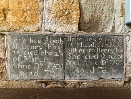 Saint Michael and All Angels Church, Church Broughton [Map]. Memorial to siblings Henry and Elizabeth Fox who died in 1701 and 1702 respectively.