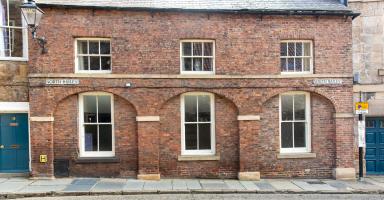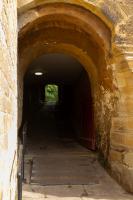 Tower on the riverside of the South Bailey, Durham with covered alley into the College.