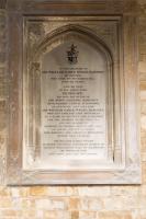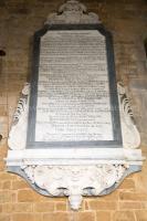 St Andrew's Church, Denton [Map]. In ashlar. The latin raised letter inscription is set in an egg and dart surround, flanked by Ionic Pilasters and free standing Composite fluted columns, supporting a pediment containing a pair of naked female figures holding hour glasses leaning on a skull. The frieze is decorated with medallions. The reclining figure of the deceased, his prayer book in hand, lies on a half rolled up mattress on a tomb chest on which are portrayed his wife and six children, all named in raised letters.