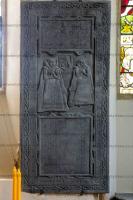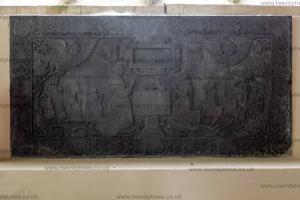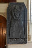 In 1592 Anna Coffyn died. Slate memorial at St Cuby's Church, Duloe [Map]. In Elizabethan dress holding gloves and book. 2 shields in spandrels with skull below.