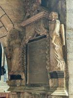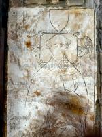 St Cuthbert's Church, Doveridge [Map]. 14th Century alabaster tombstone depicting a robed priest with his head resting on a pillow supported by angels. Probably Robert Kniveton, vicar of Doveridge around 1392. The tombstone was moved from the chancel floor.