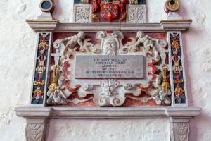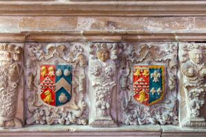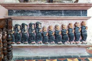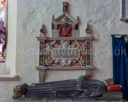 After 1656. St Edburga's Church, Leigh [Map]. Monument to Walter Devereux 5th Viscount Hereford (deceased) and Elizabeth Knightley Viscountess Hereford. Canopy suported on Ionic Capitals.