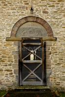 The Herefordshire School of Carving at St Giles' Church, Pipe Aston [Map]. Tympanum over the North doorway. An "agnus dei" - Lamb of God - flanked by a winged eagle and a winged bull surrounded byan archivolt of animals and foliage enclosed within a chevroned arch. The church guide describes the eagle as the emblem of St John complementing the winged bull emblem of St Luke which has at the end of one of its forelegs a block that is assumed to be St Luke's Gospel. Malcolm Thurlby, in this excellent book "The Herefordshire School of Romanesque Sculpture" suggest the carving is of a griffin. The imposts at the end of the arches have, on the left, dragons entwined, and, on the right, foliage. See Herefordshire School of Carving.