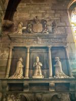 Monument to Edward Mosley at St Mary's Church, Rolleston on Dove [Map]. He dressed in judges robes. Corinthian Columns. Stuart Period.