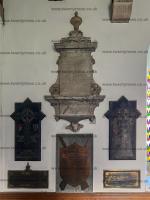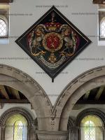 St Mary's Church, Tissington [Map]. After 2nd August 1642. Monument to, below, Francis Fitzherbert and his two wives Jane Armstrong and Elizabeth Bullock (age 67), and, above, his son John Fitzherbert (age 43) and his wife Elizabeth Fitzherbert of Norbury. The arms above show two of the arms of the Fitzherbert family. Below may be seen the Fitzherbert crest of a clenched fist - see also Church of St Barlok, Norbury [Map] for earlier monuments to the Fitzherberts of Norbury..