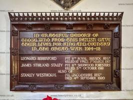 In 1683 Anne Breton died. Memorial at St Mary's Church, Tissington [Map] to her husband's first Mary Cromwell to which Anne's name has been added at the bottom.