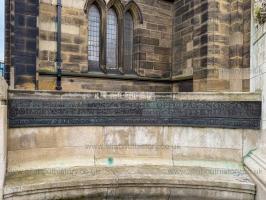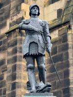 On 30th November 1924 the Northumberland Fusiliers and Royal Tank Regiment War Memorial, Newcastle upon Tyne [Map] was unveiled by the commanding officer of the Northumberland Fusiliers, Major General Sir Percival S. Wilson, and dedicated by the Rev Canon T E Crawhall, the memorial had been raised by public subscription at a cost of £3,000. The figure which represents St George slaying the dragon was designed by John W M Reid who at the time was Master of Sculpture at the nearby University of Durham's Armstrong College (now Newcastle University). The intricate detail found in the representation of St George's armour was researched by Reid during a visit to see examples of the period in the Tower of London. The sculptor of the figure was William Currie and the architects were Newcastle-based Cackett and Burns Dick. The memorial's figure is made from bronze, supported by a pedestal and screen of Portland Stone. The memorial commemorates the service of both the 6th (Territorial/City) Northumberland Fusiliers and the 43rd and 49th battalions of the Royal Tank Regiment. The latter was added after World War Two to mark an amalgamation in 1938 of the Northumberland Fusiliers with the Royal Tank Regiment. In 1938 the Fusiliers had changed from an infantry to an armoured role.