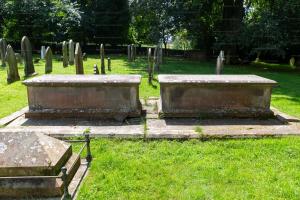 Around 1884. Graves of servants of Brereton Hall, Cheshire [Map] in the churchyard of St Oswald's Church, Brereton [Map].
