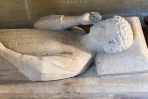 Historic England states ... "Knight of circa 1370, alabaster, with bogus Gothic inscription by Richardson to Sir John Stanley, died 1474".