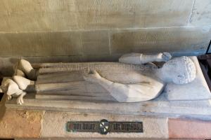 Around 1526. Monument in St Peter's Church, Elford [Map] to Isabel Neville, William Smythe (age 46) and Anne Staunton.