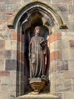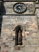 St Werburgh's Church, Hanbury [Map]. The church tower from the 14th Century with clock. A niche was set in the south side first stage of 1842 containing a statue of Saint Werburgh.