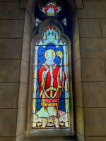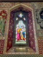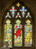 Porch at St Werburgh's Church, Hanbury [Map]. Stained glass window dedicated to Saint Maria Cleophas, one of the 'three Marys'. She was present at the crucifixion at Calvary and later visited Jesus' tomb. Married to Saint Cleophas, who was Saint Joseph's brother, she was also the mother of Saint James the Less. Memorial to Maria Anson (age 39) who married Reverend Robert Digby Ram (age 44), died 1889. Posthumous daughter of George Edward Anson and Georgiana Mary Harbord (age 77). The window commissioned by Georgiana Mary Harbord and her second husband Charles Edward Boothby (age 68) as indicated by the word 'vitricus' i.e. stepfather.