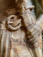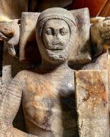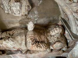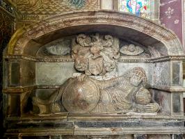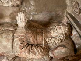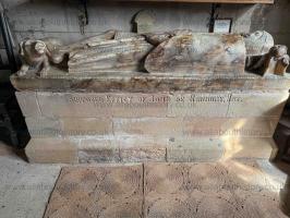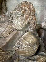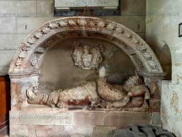 St Werburgh's Church, Hanbury [Map]. Sir John de Hanbury died 1303, in the east of the south aisle of alabaster. A recumbent effigy clasping sword and with crossed legs and dog; possibly a later attempt by the Hanbury family to add credibility to their lineage; otherwise this would be the earliest alabaster in England