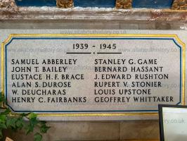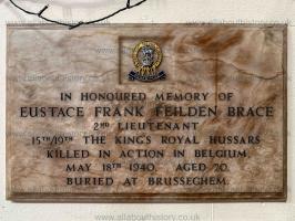 St Werburgh's Church, Hanbury [Map]. In memory of Eustace Frank Feilden Brace, killed in actoin 18th May 1940, aged twenty. He was buried at the Adegem Canadian War Cemetery, Maldegem, Arrondissement Eeklo, East Flanders, Belgium. He was sent out on a reconnaissance patrol south west from Wolvendaal (Vijlst) along Nieuwelaan. The 15/19 Hussars war diaries report the intent was to establish contact with the 5th Belgium Division who were supposed to be on the northern flank of the 15th/19th Hussars. While proceeding south west on Nieuwelaan 5th Troop came into contact with a German reconnaissance group heading north in the opposite direction near the small Sint Annakapel chapel. The German reconnaissance group consisted of several Sdkfz 234 armoured cars and motorcycles with side cars. Upon coming under fire 2nd Lt Brace had turned left off Nieuwelaan on to Vollickstraat toward Meyskens Farm. Brace then turned right after passing Meyskens farm house into an orchard and adjacent field. While the German armoured cars engaged the rest of 5th Troop on Nieuwelaan a German motorcycle and side car turn on to Vollickstraat in pursuit. It entered a field just south of Myskens farm house and moved parallel to Brace's carrier. Brace then passed through the orchard and attempted to enter an open adjacent field by traversing a small ditch. He failed to negotiate the ditch and came under MG fire from the motorcycle and side car. Brace and his crew were shot up. Brace although mortally wounded managed to abandon his carrier and make his way to a nearby tree where he collapsed. The Meyskens family recalls he asked for water and was bleeding from the lower body and that blood ran down the track for some metres. The rest of 5th Troop was shot up by the German Sdkfz 232s and according to 15/19 war diaries only one wounded survivor, Corporal Payne, managed to escape and report back. The Germans then arrived with a motor bike and side car and lifted Brace onto it. The bike was maneuvered steadily across the field on to Vollickstraat and toward Sint Annakapel. Brace died on route to Sint Annakapel.