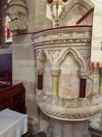 St Werburgh's Church, Hanbury [Map]. Pulpit: in the style of Street in stone and alabaster; circular on clustered columns; trefoil-headed blind arcade on marble columns around sides.