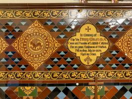 Lower part of tower walls at St Werburgh's Church, Hanbury [Map] covered in purpose-made glazed tiles of 1883 as a family memorial.