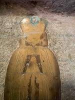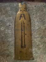 Brass under chancel steps at St Werburgh's Church, Hanbury [Map], Sir John Cheyne, Rector, 1363-91. Much worn figure with cassock, surplice, almace and cope.