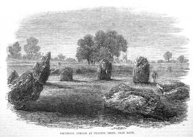 It is the center of a larger circle. Thirteen stones remain in the Periphery, and only three of them have been erected: but it is probable that the completed Circle, as it once was, had 32 Peripheral Stones, and that they had been separated from each other by 11 rods.