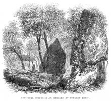 Proceedings of the Somerset Archaeological and Natural History Society Volume 14 Pages 161-172. The Cove [Map] is situated a little to the south-west of the parish church, and is formed by three stones standing in an orchard. The two side stones are still standing, but that which formed the back is fallen down. These three stones are 18 inches thick, and the respective lengths of from 10 to 14 feet. The cove [Map] is 10 feet wide and about 8 feet deep, and opens to the south-east.1 The first circle is distant 157 yards from this cove [Map] in an easterly direction the number of stones which originally composed the circle appears to have been twelve, and the diameter of the circle, according to Mr. Crocker, is 129 feet. There are now remaining in the orchard, in w'hich it is partly situated six stones, and three in the adjoining field, and one under the wall which separates the orchard from the field, making ten in all; but the circle when complete probably con sisted of twelve. 150 yards from this circle in a north east direction, is the Great Circle, the diameter of which, according to Mr. Crocker^s measurement, is from east to west 345 feet, and from north to south 378 feet. It is therefore, strictly speaking, an ellipse, with the longer axis from north to south. The number of stones remaining is fourteen, of which three only are standing, others are said to be beneath the surface. The tallest of the standing stones is 7½ feet high, and about 6 feet thick. They are all of a very rude appearance. The original number was probably twenty-four. Seyer says twenty-seven.