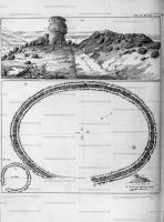 Archaeologia Volume 6 Section XIII. Plate XVII. N° II. is a view of a stone called Gorse Stone [Map], with Cat Stone at a distance marked I. This name is undoubtedly derived from a British word gorsed dau (setting aloft). Doctor Borlace says, in his Antiquities of Cornwall, that the Druids had places of elevation "called gorsed dau; in some places they were made of earth, and sometimes they were upon high rocks, from whence they used to pronounce their decrees." Now no place seems to be better calculated for that purpose, or for their inaugurations, than these stones; the other, which is the largest of the three, is called Heart Stone [Map], and measures eighty-three feet in circumference.