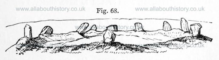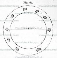 Llewellynn Jewitt 1870. Where the circles have been formed of upright stones, they have not, certainly, always been covered with the mound, but have formed a kind of ring fence, a sort of sacred enclosure, around the barrow. A great number of examples of this kind exist in different districts, and will easily be recognised by the zealous archaeologist. The circle next shown, on figs. 68 and 69, is that on Stanton Moor, known by the name of the "Nine Ladies [Map].' This circle, of which a plan is here given, is formed of a circular mound of earth, on which the upright stones are placed. It is about thirty-six feet in diameter. It has formerly consisted of a larger number of stones ; those that are now remaining being at irregular distances, varying from eight to nineteen feet apart. In the centre are the remains of a rifled sepulchral mound.