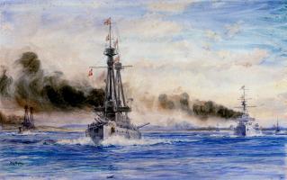 8th December 1914. William Lionel Wyllie (age 63). "Invincible and Inflexible steaming out of Port Stanley in chase".