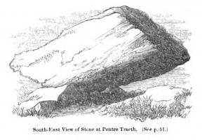 "Three small altars near Cryghyll river," are enumerated in the list given by David Thomas; Cambr. Reg., vol. ii. p. 288. Of these one may be the cromlech described by the Rev. Hugh Prichard in his Memoir on Copper Cakes, &c., Castellor, as being west of a farmhouse called Pentre Traeth Arch. Cambr., fourth series, vol. ii. p. 51. Mr. Prichard observes that it is given in the Ordnance Survey as a cromlech, but it may be described as a scattered tumulus or carnedd, with its chamber, or chambers, laid open or destroyed. A woodcut of a large fragment there is figured, p. 66.