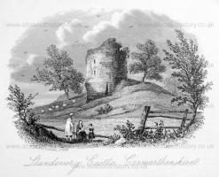 The Itinerary of Archbishop Baldwin through Wales: Book 1 Chapter 10. Having crossed the river Tywy in a boat, we proceeded towards Caermardyn [Map], leaving Lanstephan [Map] and Talachar [Map]90 on the sea-coast to our left. After the death of king Henry II., Rhys (age 55), the son of Gruffydd, took these two castles by assault; then, having laid waste, by fire and sword, the provinces of Penbroch and Ros, he besieged Caermardyn [Map], but failed in his attempt. Caermardyn91 signifies the city of Merlin, because, according to the British History, he was there said to have been begotten of an incubus.