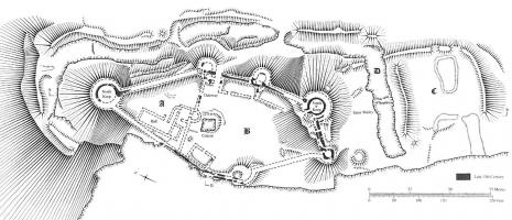 Plan of the Morlais Castle [Map] according to the Royal Commission on the Ancient and Historical Monuments of Wales, A-upper ward, B-lower ward, C-outer bailey, D-ditch.